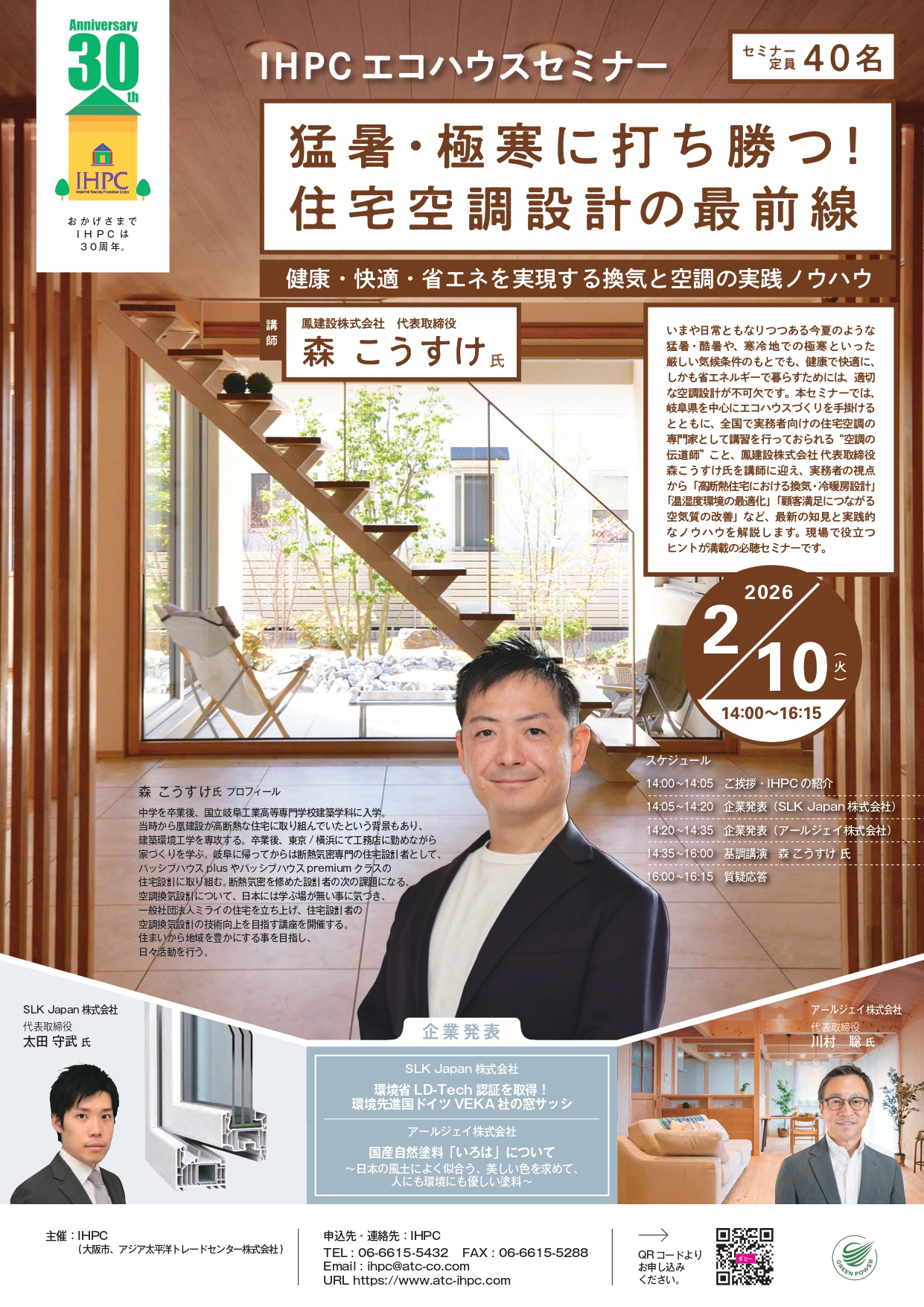 本セミナーでは、岐阜県を中心にエコハウスづくりを手掛けるとともに、全国で実務者向けの住宅空調の専門家として講習を行っておられる“空調の伝道師” こと、鳳建設株式会社 代表取締役 森こうすけ氏を講師に迎え、実務者の視点から「高断熱住宅における換気・冷暖房設計」「温湿度環境の最適化」「顧客満足につながる空気質の改善」など、最新の知見と実践的なノウハウを解説します。